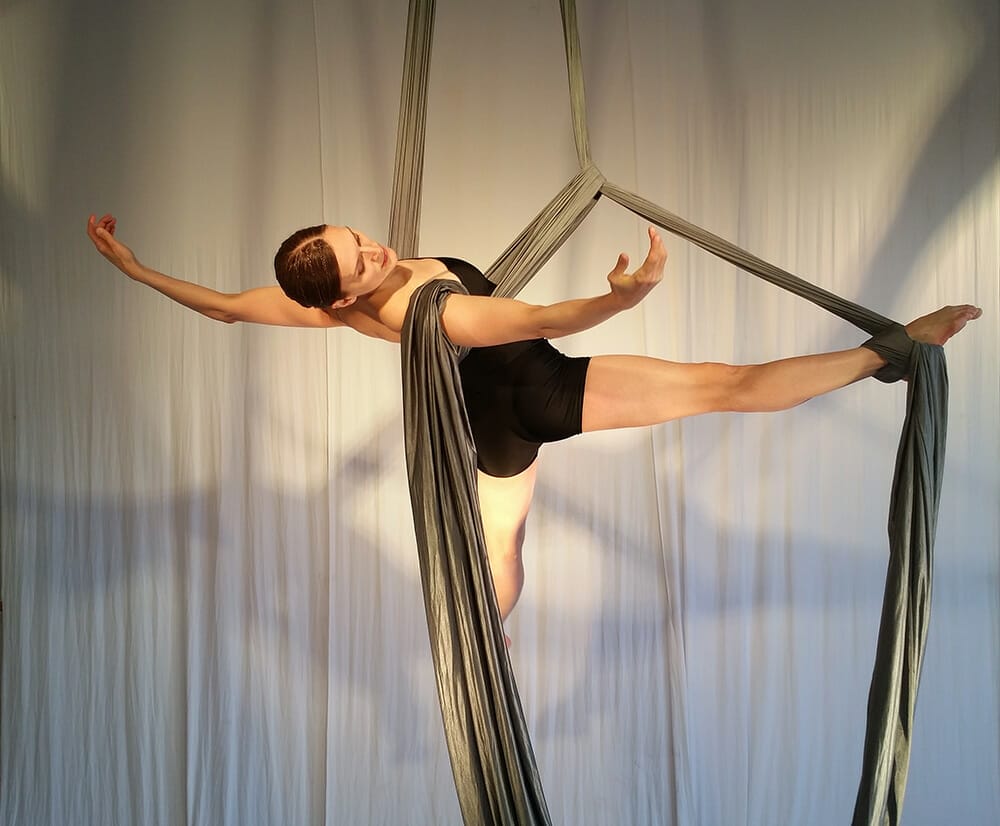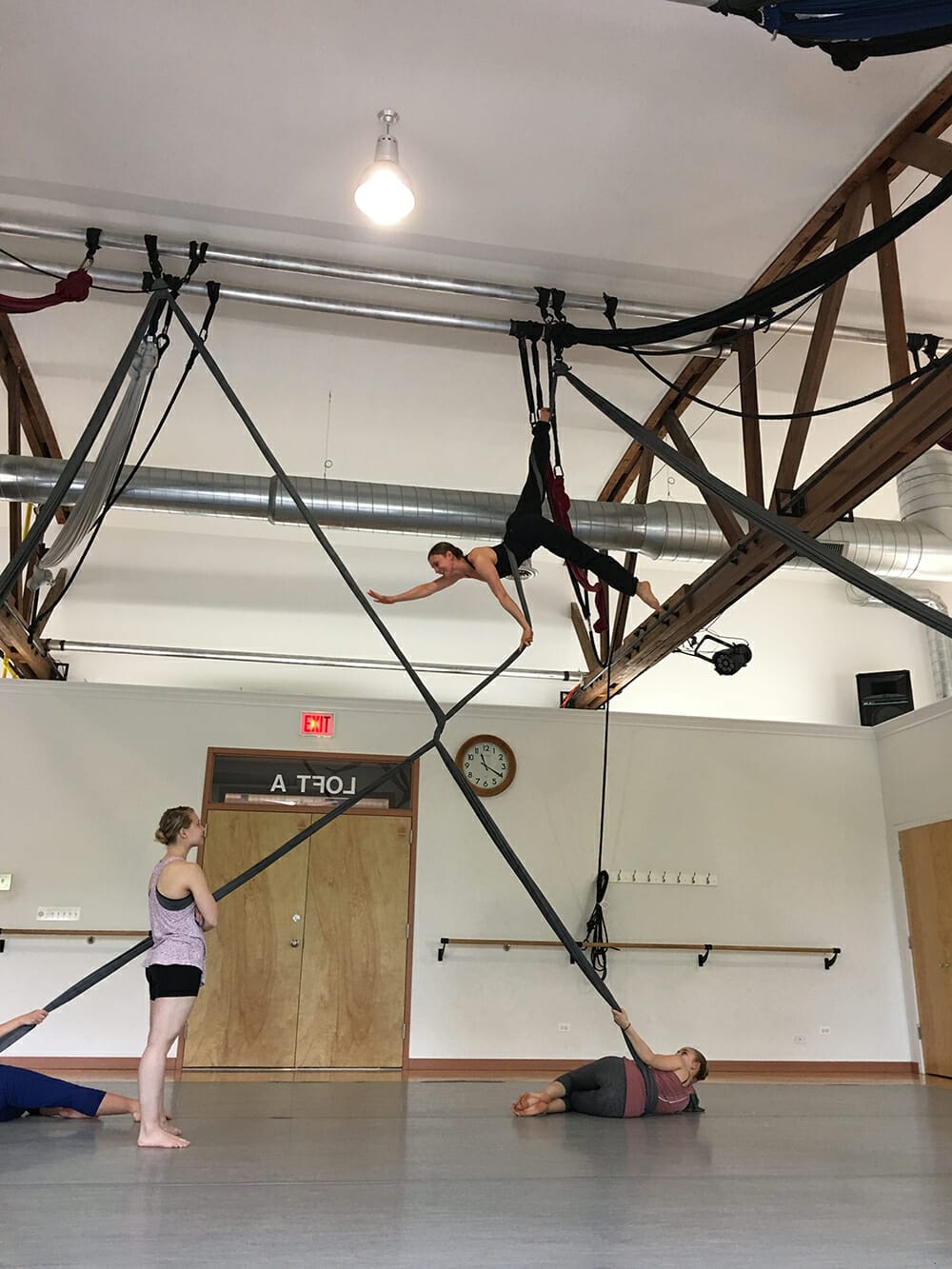 (CJ) I was studying dance at Northern Illinois University and during my senior choreography class, we had to explore the use of a prop. For my project I created a choreography with suspended ropes and bars. This was my first exploration with taking dance up into the air, and after that, I just couldn’t go back. At the time I did not know anything such as “aerial dance” existed, but I was enthralled, and it was at that point I decided I was most interested in taking my choreography into the air. Upon graduation, I realized what an extremely challenging pursuit, but with lots of persistence over many years, I was able to create and establish Aerial Dance Chicago to support this vision of taking dance into flight. The company was founded in 1999, but for the first couple of years most of my work was with ground based props because it took awhile to find a studio space that would support the aerial rigging and allow my pursuits at a cost I could afford with a very limited initial budget.