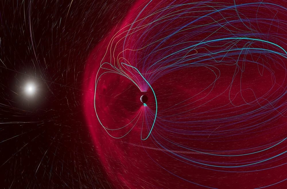 Worlds Beyond Earth audiences will also see, NASA’s Magellan mission to Earth’s twin planet, Venus, revealed a world that once may have had conditions very similar to our planet’s, but today has a surface hot enough to melt lead because of its long-term buildup of greenhouse gases. Sending spacecraft to explore Venus deepened scientists’ understanding of global warming, and illuminated that pumping carbon dioxide into our own atmosphere leads to rising temperatures and threatens civilization on Earth. In contrast, our other solar neighbor, Mars, is freezing cold. Exploration reveals that Mars’ once-plentiful water supply and active volcanoes created conditions for life but that they didn’t last long, as demonstrated in a dramatic simulation of Mars’ surface evolution. The Red Planet’s core cooled quickly, causing its magnetic field to decay and allowing most of its atmosphere to be stripped away. What is left is a dry, frozen desert—a “failed Earth.”
