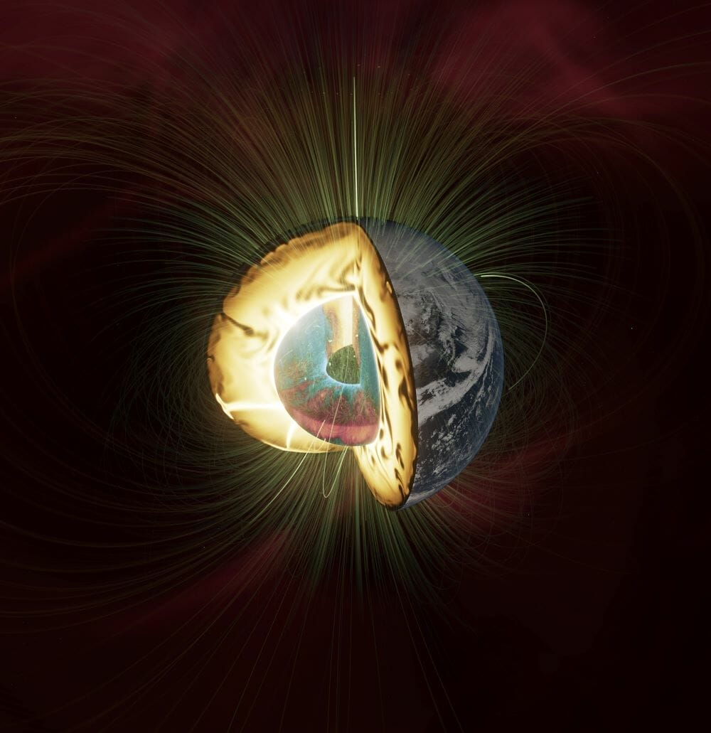 Unlike Venus and Mars, Earth is surrounded by a strong magnetic field—powered by its hot, churning outer core, which is visualized in Worlds Beyond Earth—that forms a shield that deflects solar wind and protects our atmosphere. Our planet pumps out heat, feeding volcanoes at the surface and helping to sustain this atmosphere with the perfect blend of molecules for life.