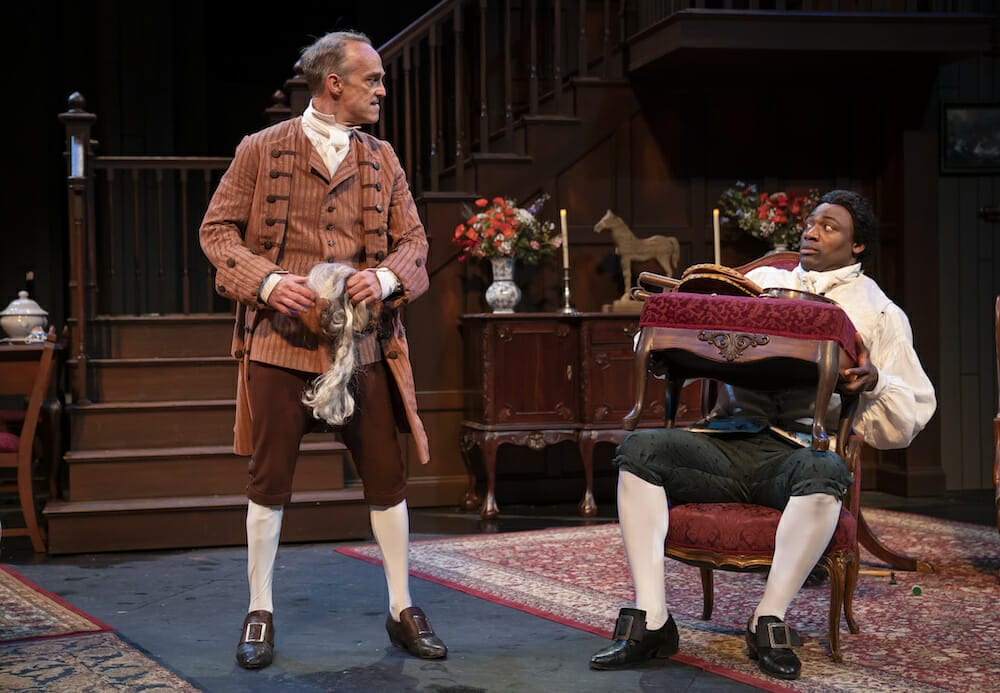 Marlow, played by Jamal James, hits his bits as an overconfident, pompous young man when in the presence of the mistaken “innkeeper.” Play him against the mistaken innkeeper, James Ridge as Mr. Hardcastle, and we are roaring with laughter as we watch Hardcastle reach his wits end.