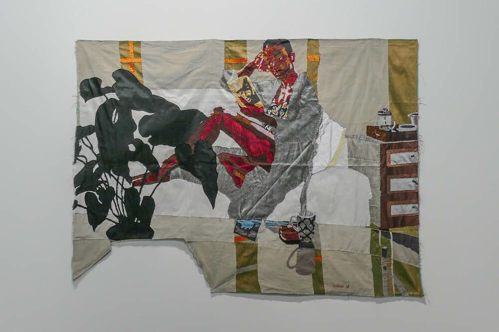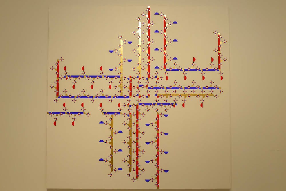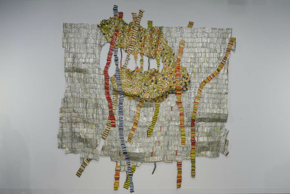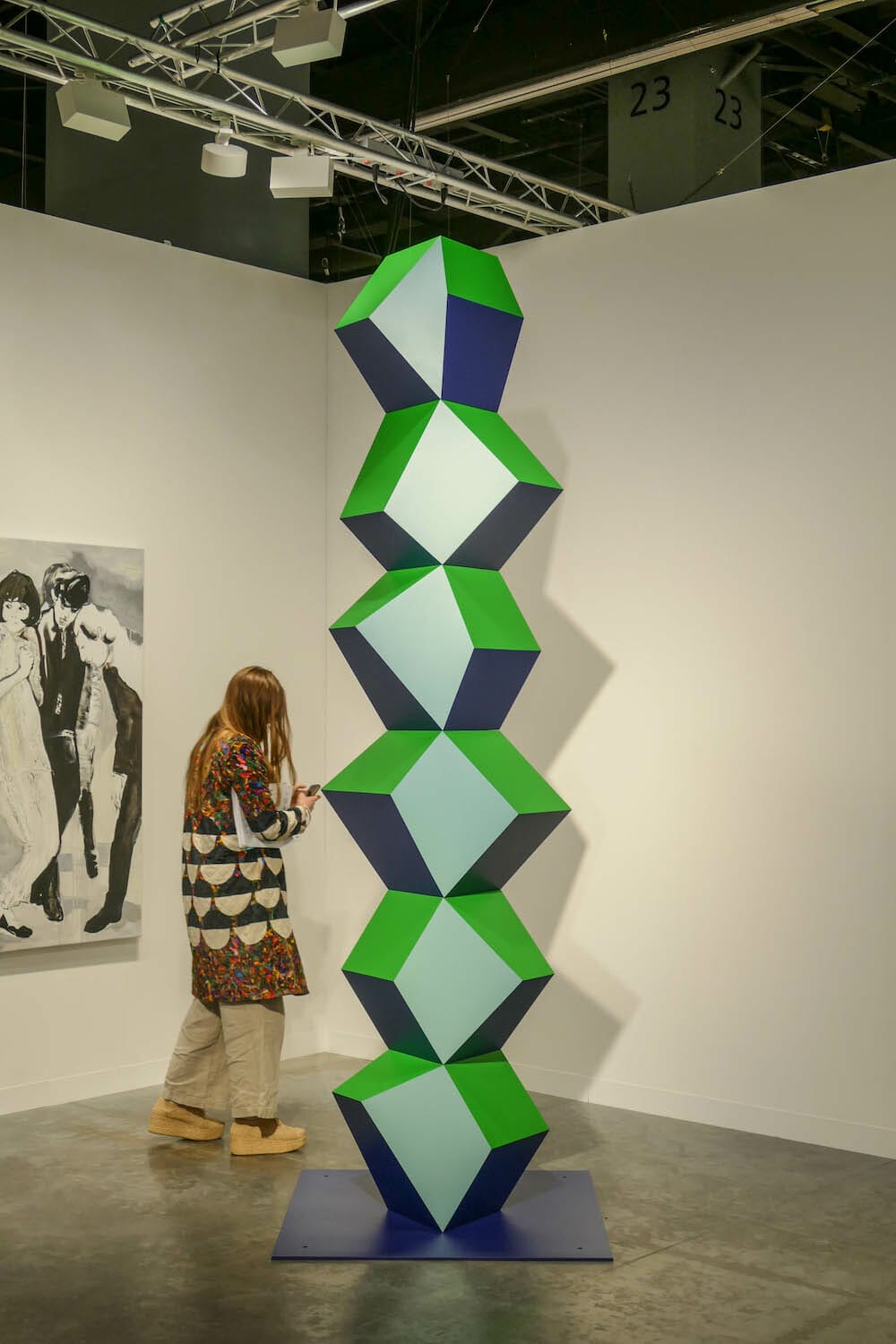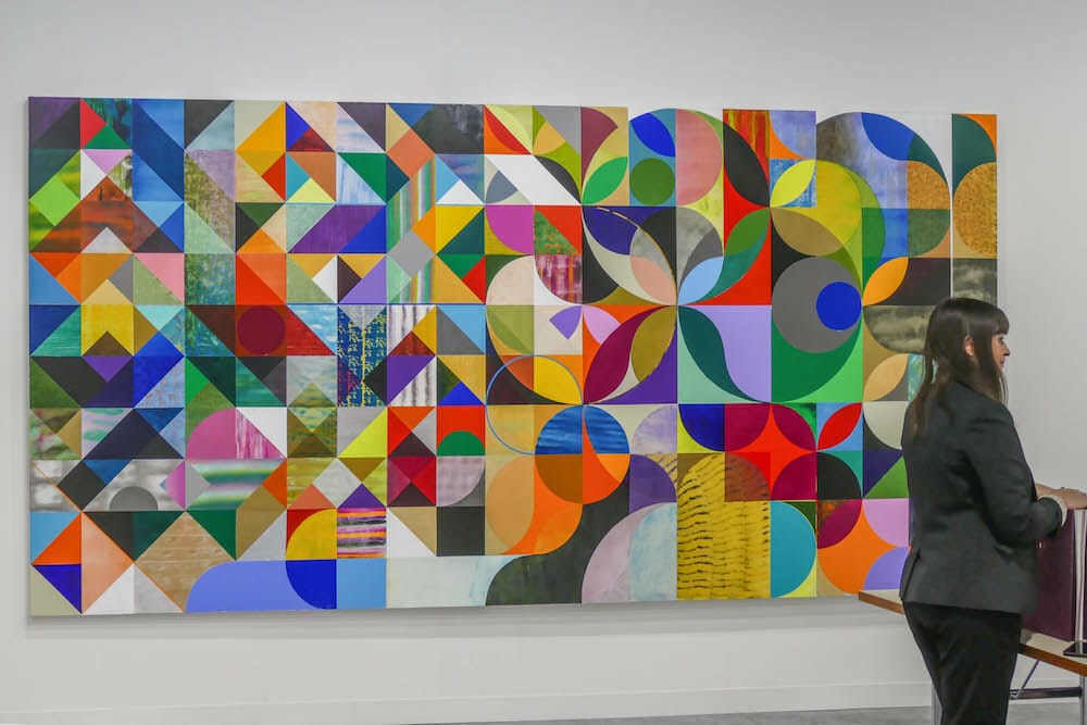 Much of the NOVA section was, in contrast, somewhat underwhelming, encouraging one to zip through and on to other sections. Striking exceptions were the standout exhibit by South Africa’s blank gallery showcasing artist Billie Zangewa’s silk collage works, the artists being exhibited by Linn Lũhn Gallery of Dusseldorf, and Jeffrey Gibson’s colorful play with geometries within geometries exhibited by Roberts Projects of Los Angeles.