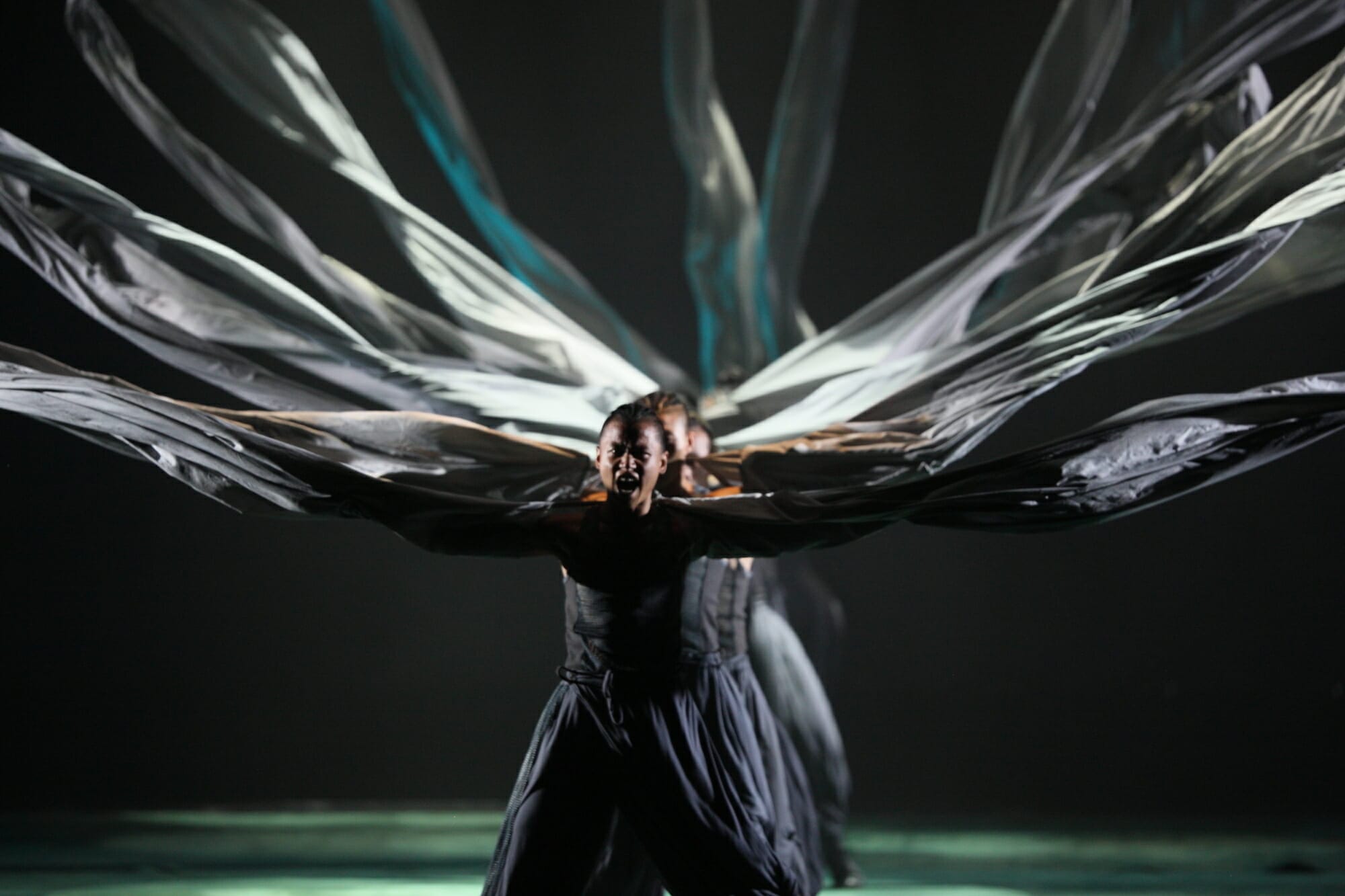 Then the troupe slows things down. Softness is a dreamlike sequence where white fabric falls from the ceiling and turquoise lights bathe the stage. White lights blink on and off to match the sound of the raindrops.