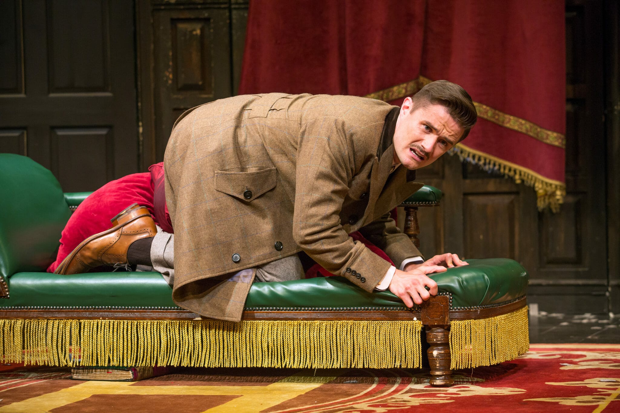 The trouble begins even before the play begins. Actually, even before that, as even the printing of the Playbills has gone wrong. The play’s title is falling off the cover page. Inside the theatre, crew members are nervously nailing down set pieces that stubbornly fall, searching for tools they’ve lost and enlisting the help of an innocent audience member to hold things in place. Once things are reasonably together, the society’s supposed president, Chris Bean (Mark Evans) gives a curtain speech that suggests the Cornley University Drama Society has had a checkered history and that this night is unlikely be any better than any other. (The faux title page of the program for THE MURDER AT HAVERSHAM MANOR lists Chris as not only the director, but also the scenic designer, costume designer, prop maker, box office manager, press and pr rep, dramaturg, voice coach, dialect coach, and fight choreographer. Oh, and Chris also plays a leading role as the detective.