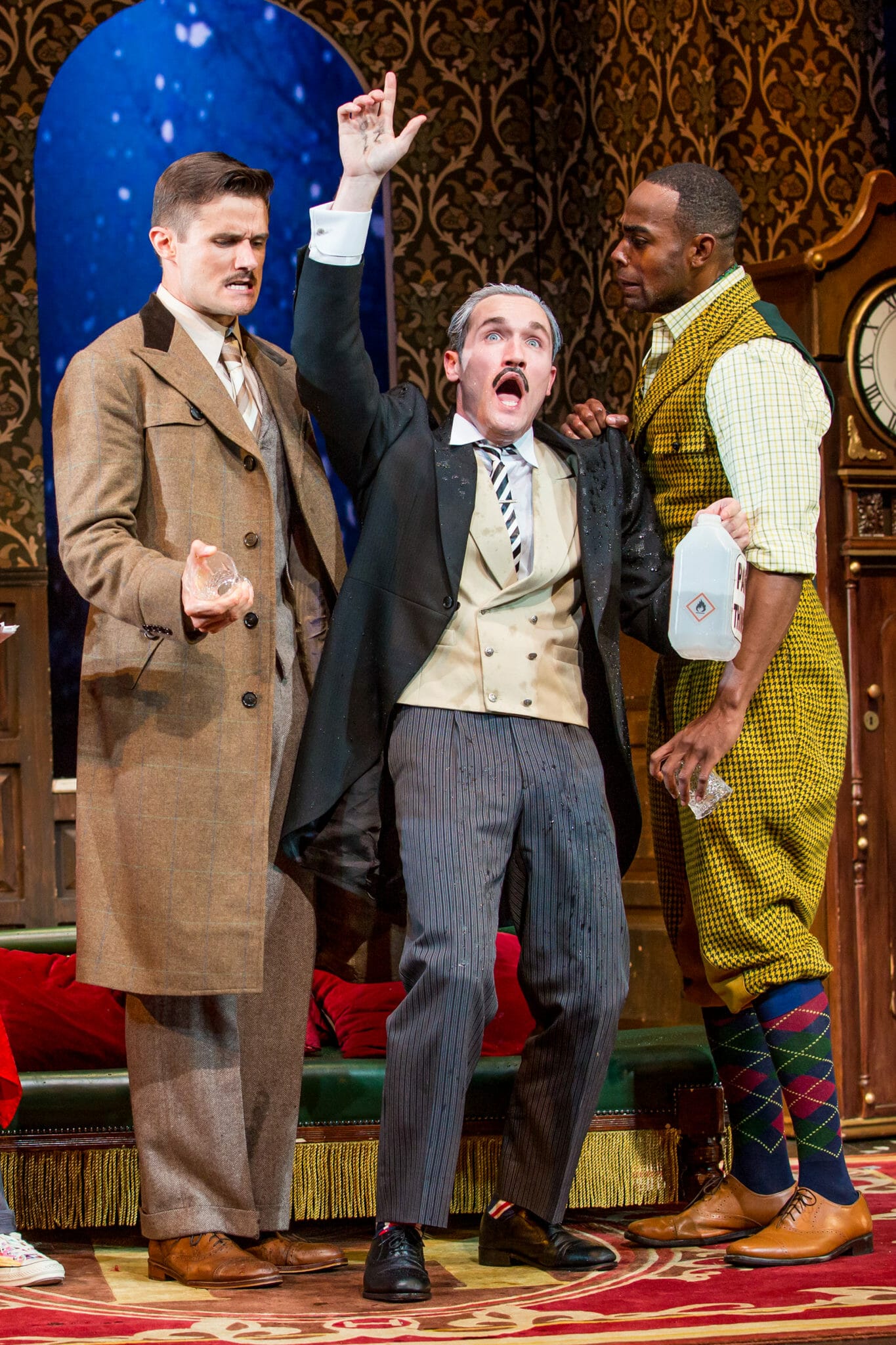 The set by Nigel Hook begins as an almost realistic, not-too-cheesy drawing room of the elegant Haversham Manor. Hooks deserves special praise, though, not only for the look of the set but its mechanics. Things fall down and apart all around the actors in a manner that’s as amazing as the physical skill and comic timing of the actors.