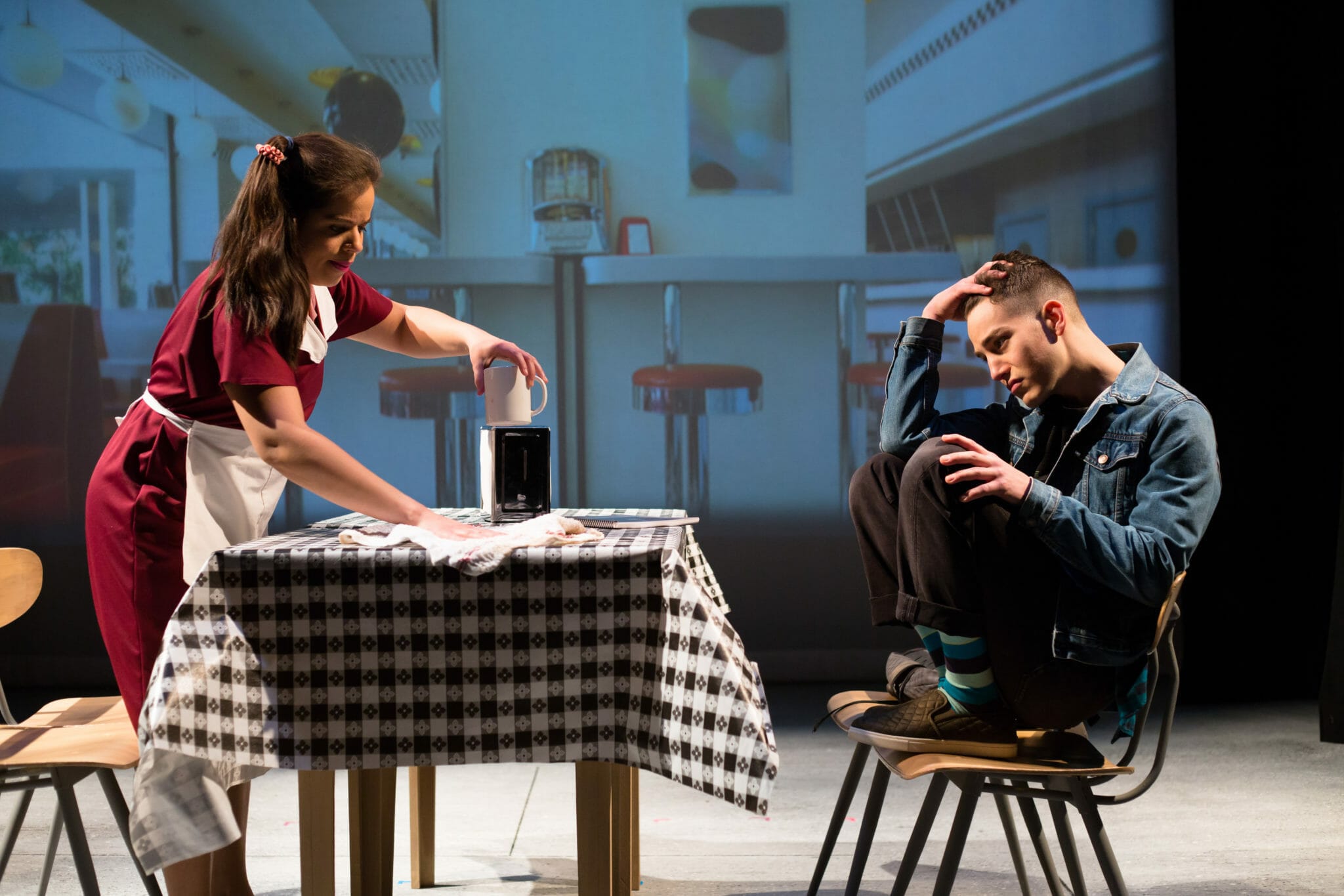 The stage is simple, with use of school desks and chairs that move about the space to represent the various locations, as well as a large screen in the back that allows for projections. Scenic Designer Torrey Meyer and Lighting/Projections Designer Erin Pleake collaborate to utilize this screen to add an extra level to the design.