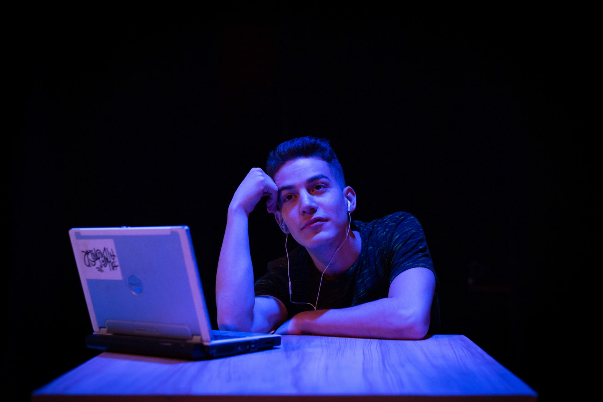 A large element of the play discusses online activities at home – from Diwata’s podcast that she airs about her life, to Solomon’s research for his journalistic pursuits, and Howie’s use of online chatrooms. Lipschutz and Meyer split the stage itself into three sections through pushing aside the desks, creating three “bedrooms,” and Pleake in turn splits the screen into three sections, with the far left for Solomon’s room, the middle for Diwata, and the far right for Howie. In addition, the audience can see online chats and websites projected on the screen, allowing them a window into the activities of the teenagers. The use of the screen is effective, and adds a nice touch to the production.