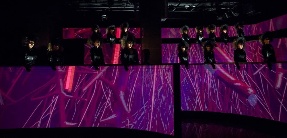How fascinating too to watch the women spawning paper dolls by machine—perhaps a nod to their role in society as breeders alone. Like any poem it’s wide open to interpretation. Like the best poems, these stagecraft effects cast a seductive spell.