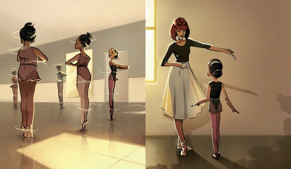 From the moment the little ballerina on the cover slipped from the envelope that covered her, the graceful, triumphant painting on the cover of BUNHEADS telegraphed ballet perfection. Her legs seem twice as long as the average human’s, her shadow trailing behind her could be the figure whirling in an open music box. The story that unfolds in lively and animated paintings is indeed a ballet fairytale come to life. Young Misty Copeland wins the starring role in her very first ballet recital: the human woman Swanilde, the hero of the tale of Coppelia. Even the fly leaves provide ballet inspiration in their simple line drawing breakdowns of steps from the ballet. Within the story’s pages, painted ballerinas whirl and leap and, in one especially memorable image, young Misty’s leg whirls in a many legged circle that stretches from the floor to above her head in a move the book identifies as a rond de jambe to tendu front.