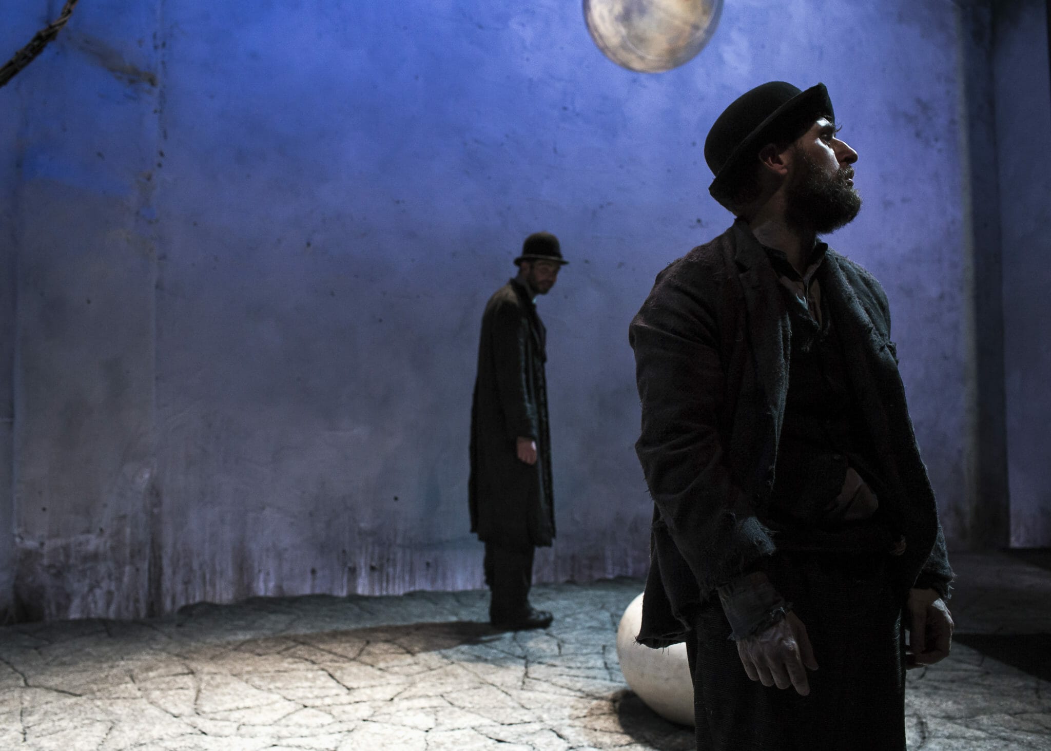 In a word, the set is exquisite. Dadaesque in its surrealistic simplicity, the stark landscape of nowhere, punctuated by a barren tree and large stone. The shabby tramps Estragon (Aaron Monaghan) and Vladimir (Marty Rea) bicker, contemplate suicide, discuss life, and wait endlessly for M. Godot. They discuss separating and/or leaving but are unable to do either. Enter the fantastic duo of master and slave, Pozzo (Rory Nolan) and Lucky (Lombard). The actors are nothing short of spectacular in creating the world of the play—in which the apparently insignificant becomes alarmingly important. Estragon and Vladimir are all of us, of course—lonely, desperate souls seeking escape and finding solace, humor, and at times, imprisonment, in each other.