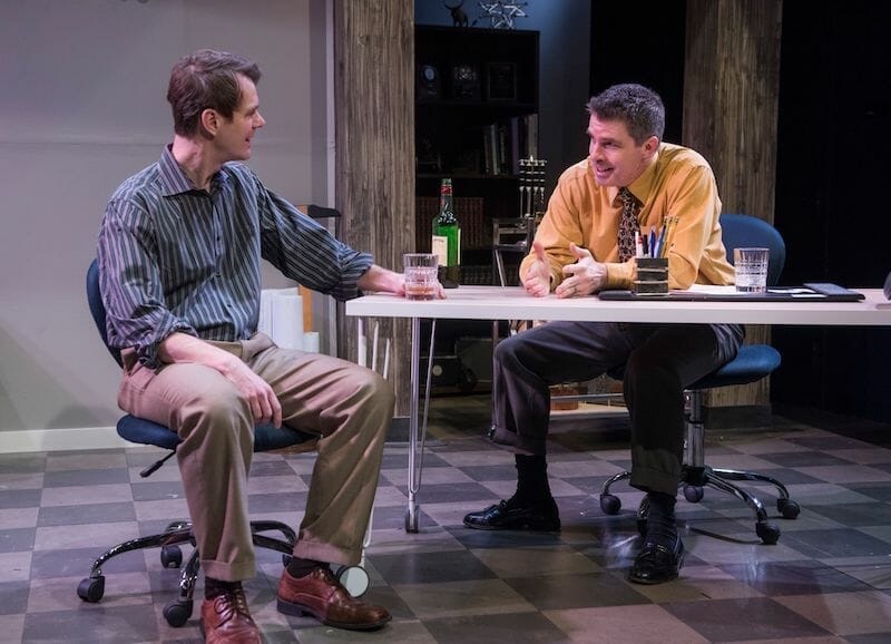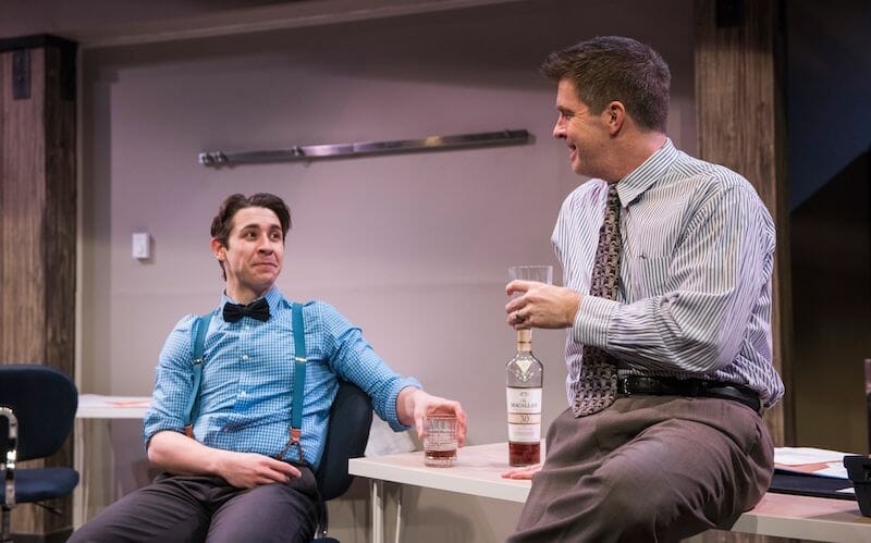 As the lights come on we hear a sloshy Stu (Charlie Strater) hold forth on how his life has become unbearable because of her. Like many downing whisky at this fast clip, he feels misunderstood by his audience, in this case Ben (Ted James), an earnest underling in the architectural firm Stu manages. Strater’s Stu is so convincing that we feel a vicarious blood-alcohol rise.