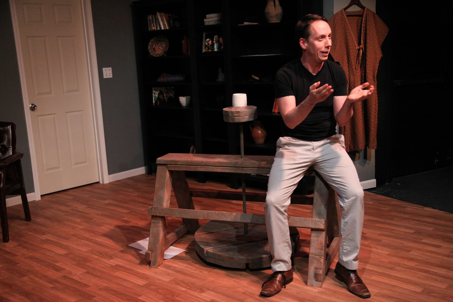 Where JESUS THE JEW falls flat is the barely there parallels between Jeremy’s life and James’. It’s more like a history lesson because the focus is on unknown facts about Jesus’ life. The set designed by Milo Bue intends to blur past and present. Artifacts around Jeremy’s office also serve as props when James needs them to demonstrate a Jewish tradition. This brings the two stories closer together.