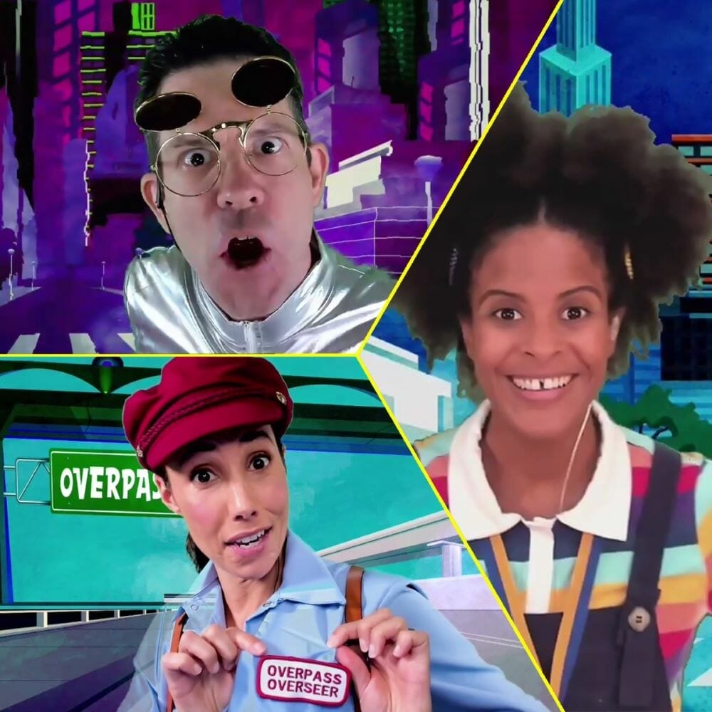 It’s worth mentioning that the entire adventure is executed by three performers: Your Voice (Gabrielle Maiden), who guides you through the narrative, and two ensemble members (Michael Faulkner and Shyla Lefner) who don many hats to portray the remaining city inhabitants who haven’t left town due to The Stench — a villain of odorous proportions. All of them sing songs that either further the plot or offer a learning opportunity, some in a Seuss-like manner, some akin to Sesame Street. These characters often need help from the participating children to solve the next move via puzzles and tools, with various elements of the suitcase coming into use a la Mickey Mouse Clubhouse. The story and especially the wordplay (fun with homophones) are reminiscent of The Phantom Tollbooth. There are numerous other children’s educainment entities that it pays homage to and even a sense of meta-reality as this virus, ahem, Stench, keeps everyone apart.