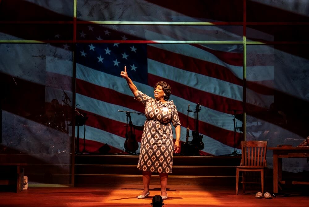 Faye Butler as Fannie Lou Hamer bounds onto the stage with weighty purpose in her stride. We register her gait subliminally as both telegraphing more than average aches and pains of age AND way above average determination. There is flag bunting throughout the theater and vestiges of some red, white, and blue confetti throws on the floor that place us in the 1964 Democratic Convention. It is perhaps THE moment for which Hamer is most known. As head of the Mississippi’s Freedom Party Delegation, she is demanding that they be seated. Just as she began making the case against the all-white segregationist official delegation, her microphone is cut off.