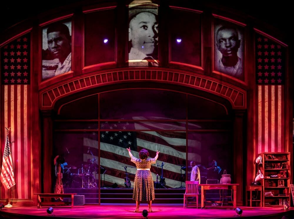 Projections in the background help move the story from the courthouse, where Hamer attempts many times to register to vote, to the jail house where she is tortured, and to the cooperative farm she helped build in Mississippi. Iconic images of Emmett Till, Rosa Parks, Harriet Tubman, Medgar Evers, and Goodman, Chaney and Schwerner move from backdrop to foreground as the story unfolds. Three musicians that accompany Butler have fleeting moments when they join the action. Yet, but not for a second does the bright klieg light in our mind lose focus on E. Faye Butler as Fannie Lou Hamer. This is a tour de force one-woman performance, in this writer’s view. Butler has simply impeccable timing. Her cadence, her break out into soulful Gospel singing embellishments, and mostly her ability to convey that keep-on-keeping-on look to the future as she marches on refusing to be wearied shows us the entire story of the Civil Rights Movement then and now.