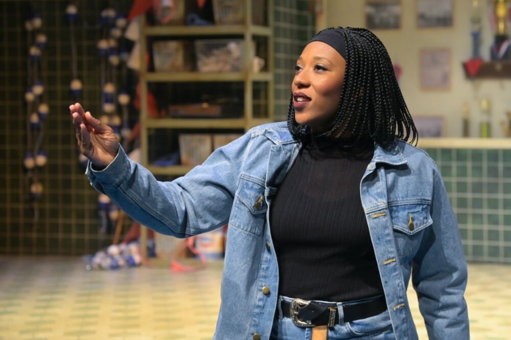 When Janice’s mother Helen (Aneisa J. Hicks) and her sister Gayle (Brianna Buckley) first enter the scene in their bathing suits, we find ourselves with them in a community center, replete with old-style lighting and signage that looks like it has seen better days. Upstage we see a wall of old trophies and photos, and downstage is a pool that slowly starts to fill with water. As the supportive younger sister, Gayle helps Helen make her way to the steps and down into the pool. Both are so excited and ready for what comes next.