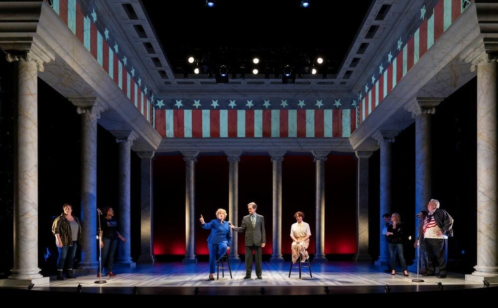 Scenic Designer Collette Pollard transforms the Goodman’s Albert Theatre into the Supreme Court, capturing its grandeur – complete with white columns that line either end of the stage. This re-creation of the Supreme Court chambers is completed with a row of nine tall seats behind a large wooden stand.