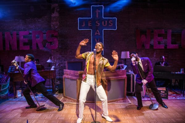 One especially fun scene was during Marty’s tour – specifically the “Marty Roy and the Up to Something Bible Belt Tour.” The stellar band lives at the back of the stage for the entire show, and for this scene the intimate space makes it feel as if the audience is in the middle of a concert. Marty takes the lead, with Abee and Andrew (Breon Arzell and Michael Turrentine, with hilarious stage chemistry) as his backup dancers. Arzell’s choreography takes up the entire stage, and when combined with Lighting Designer Jason Lynch’s flashes of bright colors, it was truly an event to see.