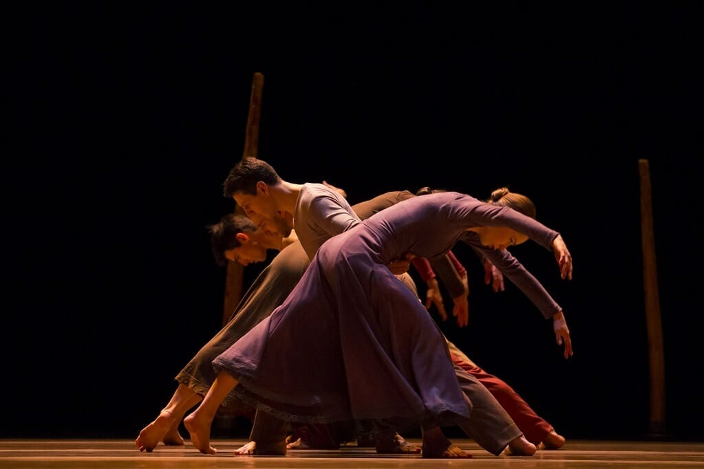 Duato’s second piece of the evening’s performance is actually the first work he choreographed, which premiered in 1983 for Nederlands Dance Theater. Jardi Tancat, (closed garden) explores three couples as they plant and sow the barren Catalonian land. Set to Catalan music recorded by vocalist María del Mar Bonet, the work begins with simple drumming as the three men (Hortin, Schultz and Lochner) dance, their spines undulating and pulsing as their backs face the audience. The connection to the earth is made evident by the very grounded movements, constantly cycling from reaching towards the ground to upwards to the sky. The women (Tong, Leriche and Lopez) similarly display fluidity in their spines as they as carve through the space, embodying strength in this pastoral landscape. At one point, four dancers lie down with their backs facing the stage, seemingly to rest, as they watch two other dancers. The physicality and endurance of working the land is danced beautifully by the six dancers and I felt transported for a moment back to this era that Duato aims to depict.