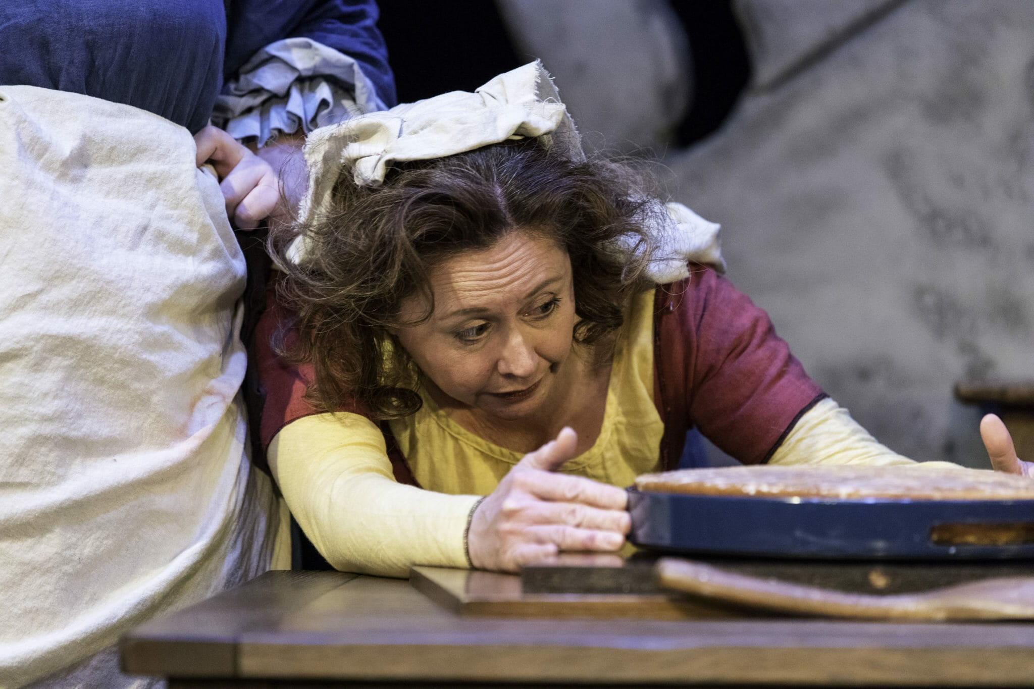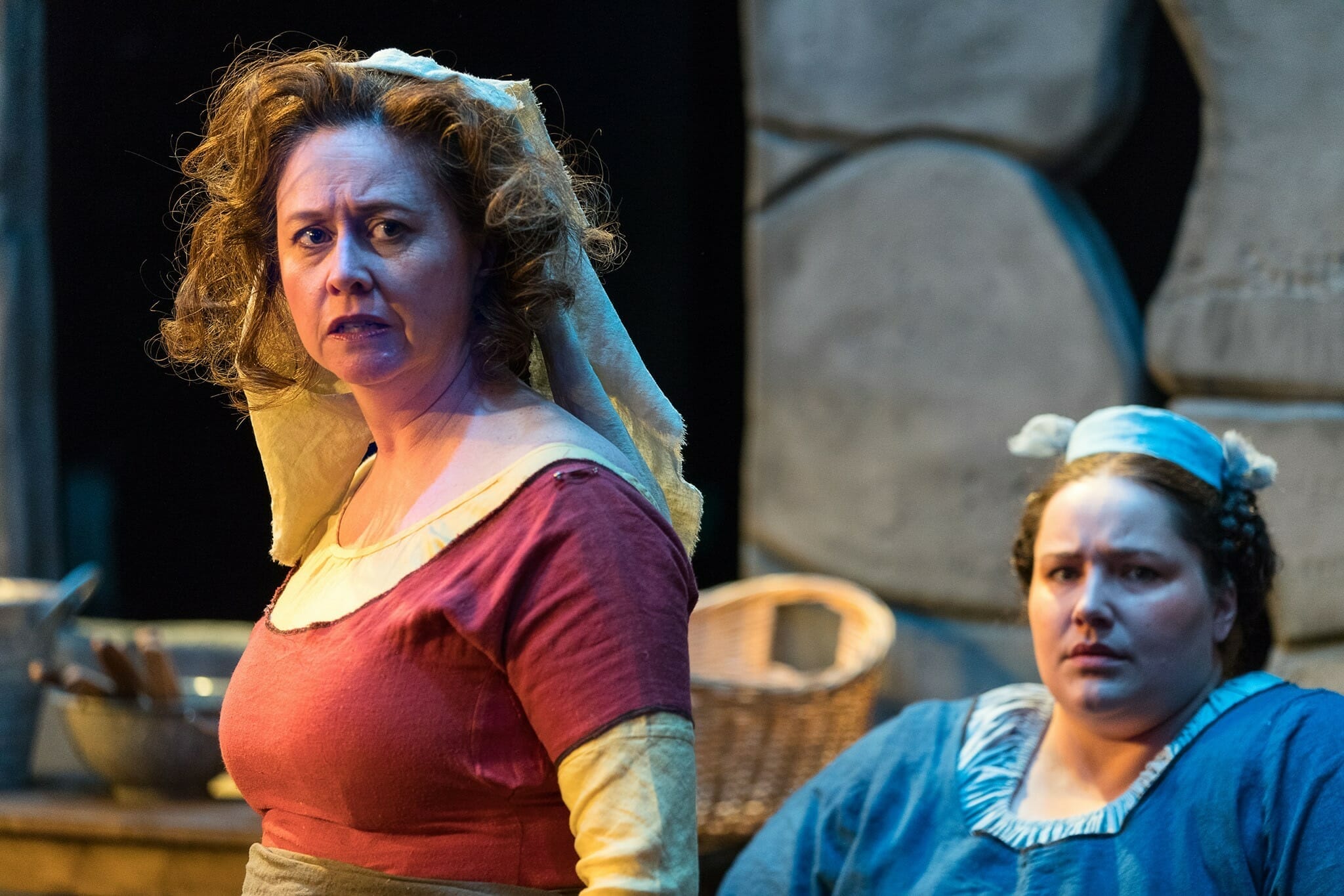 THE SCULLERY MAID transports us to the 1300s and a different world where family ties and legacy are everything. The Edge Theater space begins to set the scene with medieval music playing upon entry. We see the stage set with gray stone walls that climb high around a kitchen with a log fire ready to prepare a feast.