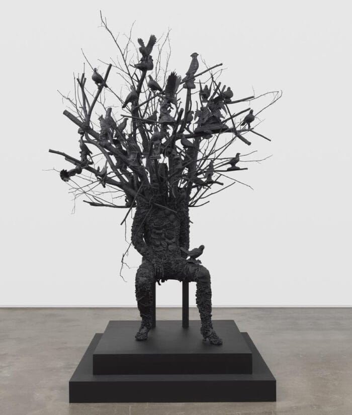 “...Cave introduces two distinct series that push his singular style and vision to an epic realm, while maintaining an intimate and personal conversation with his audience. Anchoring the exhibition is a series of three large bronze sculptures, titled Amalgams. These contemporary monuments create a positive, inclusive and resilient alternative to the plethora of public art that has often misrepresented history, silenced diverse voices and commemorated war and conquest. The Amalgams are an evolution of Cave’s iconic Soundsuits, which were created in response to the brutal beating of Rodney King by police in 1991. They concealed race, gender and class to force the viewer to engage without preconceived judgment. In the new Amalgams Cave fuses casts from his own body with natural forms such as flowers, birds and trees with similar effect.