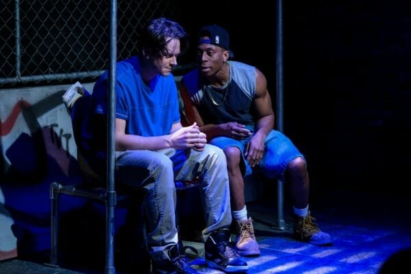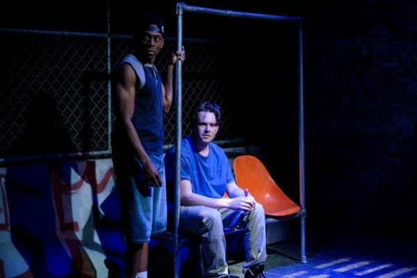Scenic Designer Ryan Emens’ set begins fairly minimalistic, with a set of New York subway seats on stage left, and a park bench on stage right. These two elements live right in front of a large fence with graffiti at the bottom. Emens’ set offers just enough to give us a sense of the location, and there is little space between the audience and these pieces. Clark and Emens’ collaboration allows us to focus more on the characters themselves, and the feelings that both of them have surrounding their new “friendship” – inviting us to even feel those emotions alongside them.