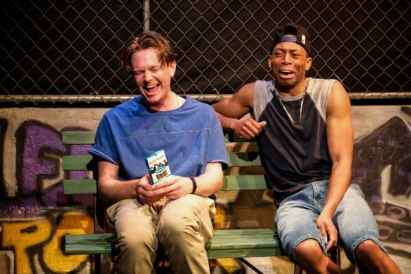 Clark does not waste time throwing the audience into the action. Early in the play, Eric convinces (or semi-forces) Steve to get off the train with him, and join him for smoking some pot in the park. Agada showcases an impeccable sense of comedic timing through these interactions, creating a sense of uncertainty on whether or not he can be trusted as he urges Steve to join him along for the adventure. While the situation feels questionable, there is also a certain level of light-hearted fun.
