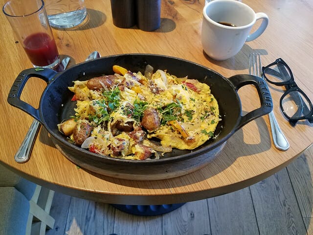 The hotel’s single restaurant is Tre Rivali, with an Italian theme appropriate to the neighborhood’s history as an enclave of Italian immigrants. Tre Rivali’s Executive Chef is Heather Terhune, a former contestant of TV’s Top Chef, and she’s created a menu encompassing everything from simpler Italian fare like hand-made pastas and wood-fired pizzas to large plates of seafood, pork chops, chicken and steaks. Regional Wisconsin foods like cheeses and butternut squash apple soup are also featured. This writer enjoyed a flaky swordfish, accompanied by a rich and creamy corn flan. The menu also includes a selection of tapas that can be ordered as appetizers or in lieu of a single entrée. A particular highlight of this writer’s dinner was a dessert of a warm sticky toffee pudding cake, served with vanilla ice cream. Servers are dressed in a casual-chic uniform of perfectly pressed jeans and white and blue checked shirts that project a feeling of professionalism and friendliness.