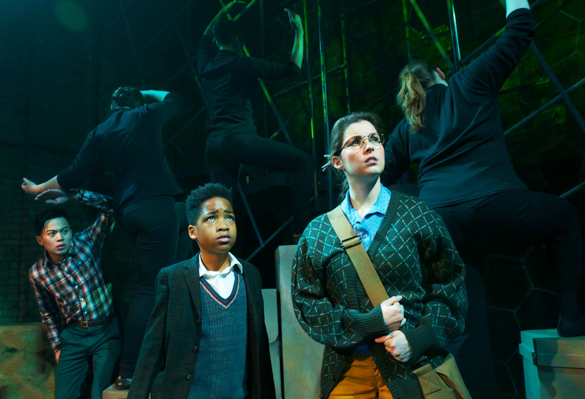 In addition to the design elements, Kauzlaric utilized the ensemble of actors to help carry the story from moment to moment. For example, when the kids moved into a different universe, the ensemble, dressed in black, would gather and lift the kids, bringing them to various areas of the stage. Dressed in black, the ensemble enhanced the mysterious feel of the stage.
