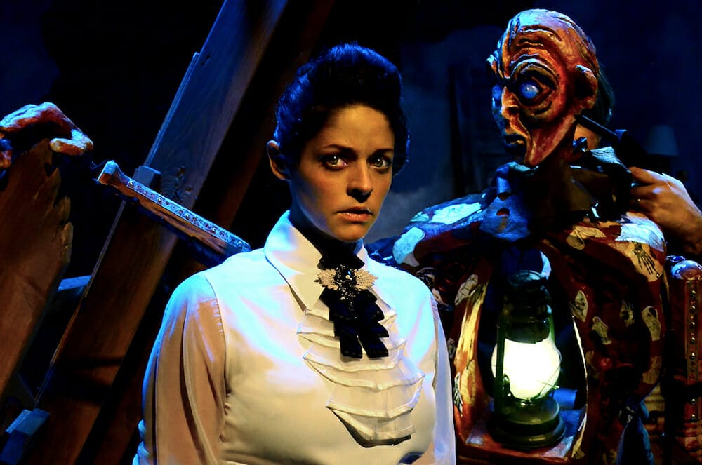 Her creation, a human-sized puppet designed by Cynthia Von Orthal and voiced/operated by Hainsworth, squarely occupies the uncanny valley, both grotesque and piteous, humanoid and other. They beg Frankenstein for guidance, acceptance, communion with another living soul; aghast, she rejects them and refuses their pleas. The Creature’s needs and Frankenstein’s refusals feed on each other, building inevitably to further tragedy.
