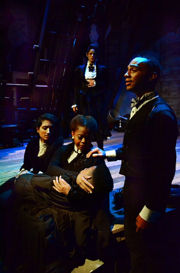 Although Robert Kauzlaric’s adaptation retains elements both of horror and of science fiction, the genre Shelley originated, it is not so much a horror story or a sci-fi story as a meditation on loss and grief. From Victoria’s mother Caroline (principally played by Risha Tenae, ably understudied by Julie Partyka) informing her of Alphonse’s death to the final confrontation with the Creature, a sense of desolation looms. Jordan Kardasz’s crepuscular lighting and Barry Bennett’s elegiac music reinforce and enhance this feeling.