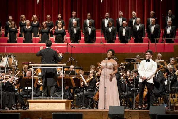 Then glamour strode on to the stage—in the person of J’Nai Bridges garbed in a luxurious turquoise high-fashion gown, whom we learned was an 11th hour substitution. Really? Singing from Saint-Saëns Samson et Dalila with regal bearing and voice, she smiled to the chorus of “BRAVA” coming at her conclusion.