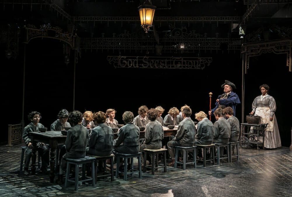 A long, oak table with a cream satin tablecloth resides center stage (Set Design: Jeffrey D. Kmiec, Properties Design: Sally Zack). It harbors all the ornate, ostentatious dinner accoutrements one would expect from an upper class, Victorian English society. Old men in extravagant clothes quietly indulge in a feast, when suddenly, their tremendous privilege is interrupted by the arrival of sixteen young, disheveled orphan boys. As they begin to sing the fan-favorite song Food, Glorious Food the boys, as well as ensemble members, begin to strip away the garish set pieces, dismantling the aristocratic fantasy they appear to have created in their minds. The orphans are left with a bare table, their tattered clothing, and one another. We are left with a heightened sense of classism juxtaposed with the enchanting charm of sixteen children.