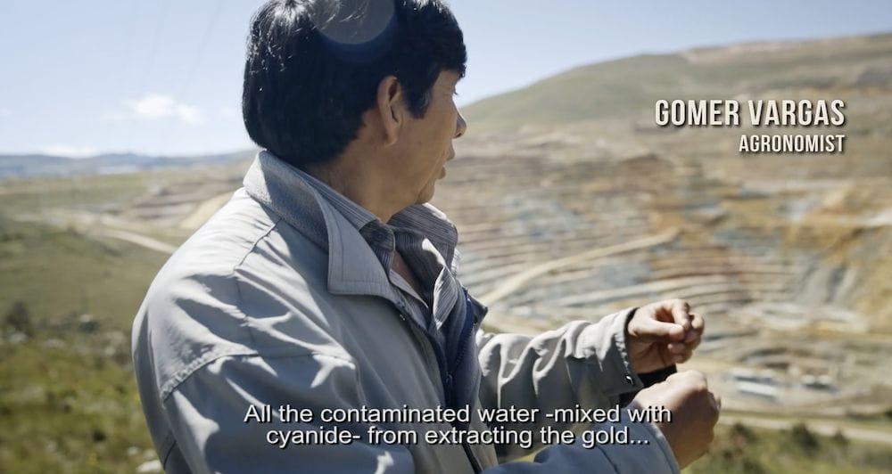 After the sun sets over Tragadero Grande, the filmmakers bring us to a new morning and new landscape. Just beyond the cyan colored water reserves are open-pit mines surrounded by arid, lifeless land. These industrial mines are dug deep into the mineral rich rock, like pyramids turned on their heads. The narration informs us: Peru has some of the most relaxed climate guidelines for mining corporations. This is part of why Newmont and Buenaventura Mining Companies desire to expand their territories in the countryside. They, like many others, embrace the ease of exploitation – as evidenced by the desert in the midst of the rolling prairies. Máxima’s land is a jackpot of precious mineral.