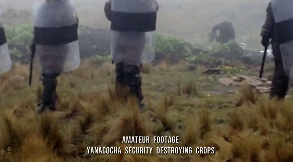 Rough handheld footage shows Peruvian police approaching Máxima’s property. Armed with riot gear, they form a barricade across the dirt road.