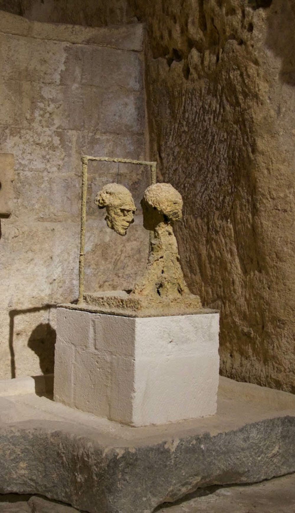 Here are varied sculptural works—from both Italian and foreign artists—that seem to thrive in situ. It’s an equivalent of the best wines being made of grapes cultivated in a best-match nutrient-rich environment – a terroire. MUSMA—part cave and part palace built upon the caves—strikes this writer as a best possible terroire for contemporary sculpture. Stone, wood, metal, castings—all physical forms that sculpture’s soul is rooted in—breathe easy here.