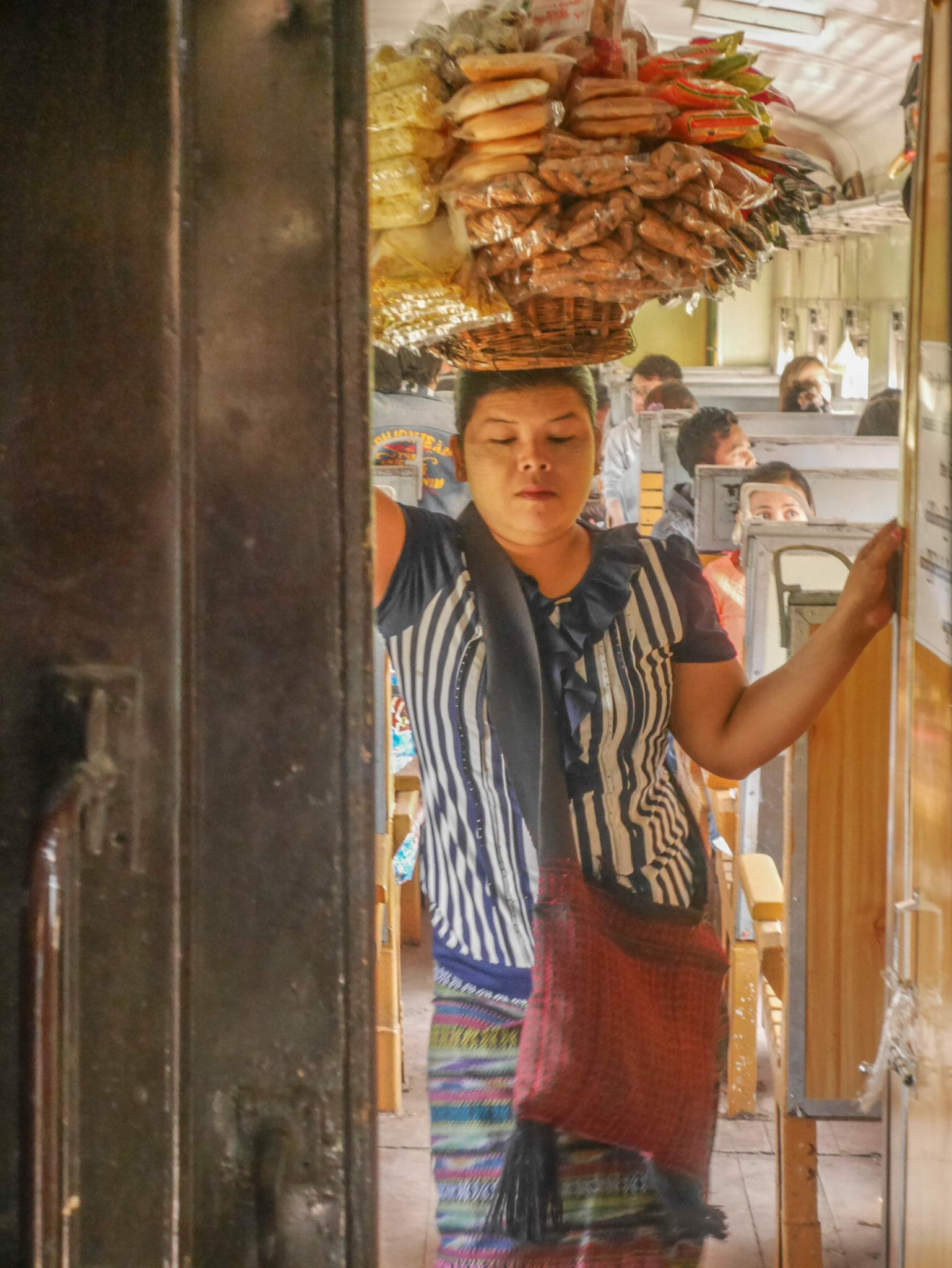 Cooked meals, junk food snacks, juice drinks, fresh fruit, Myanmar beer and more- it’s a moving restaurant with hawkers getting on the train at one stop and getting off at the next.