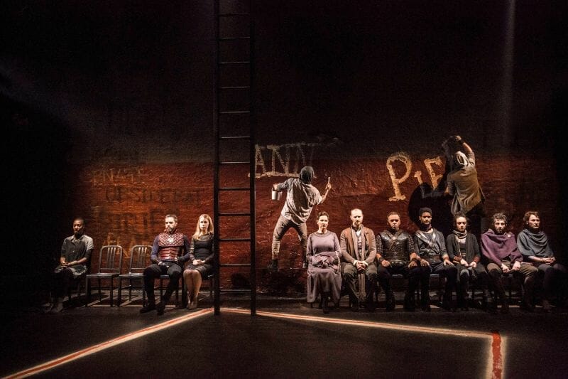 With a set of neutral colors, every color or other set accent steals attention. From the beginning, the tone of the set is created with a nearly empty stage, save for one black ladder, bathed in a dusty blue light, which returns throughout the play. But despite its simplicity, the set remains dynamic with a collection of simple, black chairs placed and replaced to simulate barricades during battle, senate seats and home furnishing. The back wall is a static slab of stone with the Latin phrase “ANNONA PLEBIS” graffitied on it. At some times, ladders are projected on it, at others, words like “traitor.”