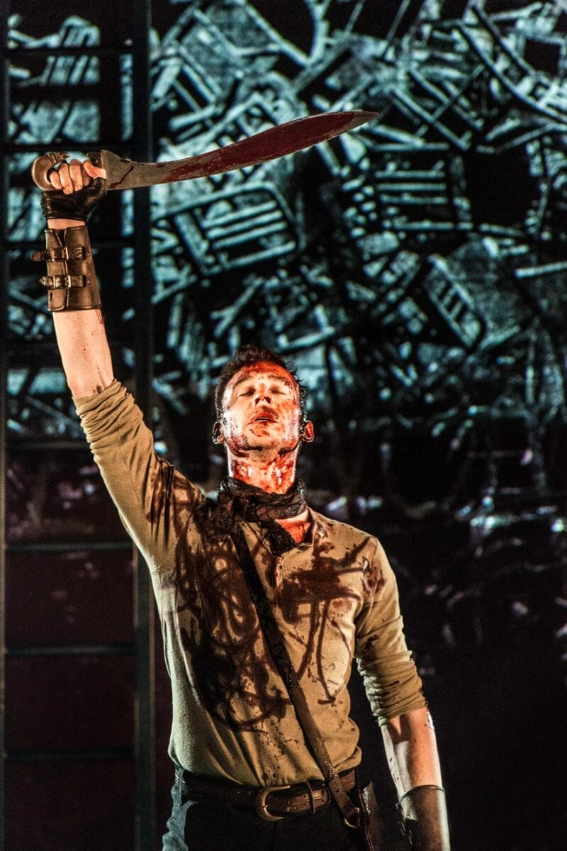 Red cascades down on general Gaius Marcius Coriolanus at every turn. Within his first few moments onstage, his own blood is crusted into his short, cropped hair, and it drips down his face. When that is finally gone, rose petals float down around him and his adoring fans after the heat of battle has cooled and he has returned home victorious. And even as the petals linger, red tickets, signifying which of his fans and critics may speak to him, like modern backstage passes, litter the floor. The piles of these passes grow thicker and thicker until he is exiled from Rome. Later, in his final moments, life leading into death, once again, his own blood drips onto his head—trickling down his chest, throat and slack lips—as he is hung upside down and gutted like an animal.
