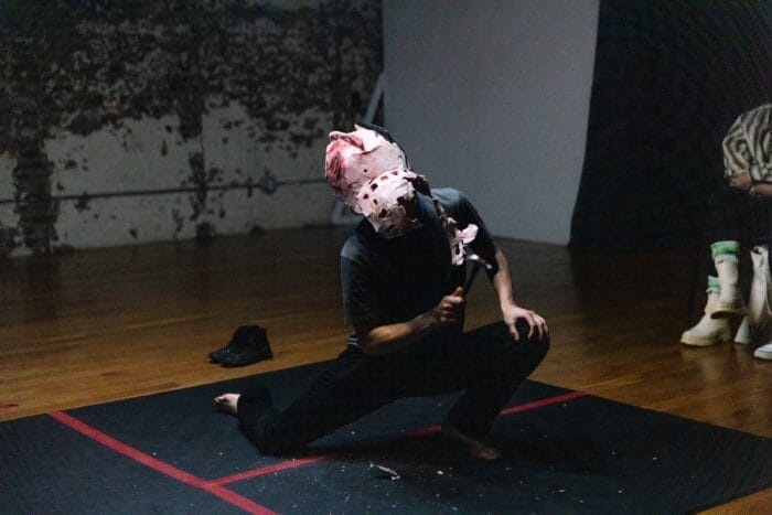 Five performers croon and shout after a fleshy landscape. They collectively search for, question, and exaggerate their own senses of self. Muscles contract and expand and emptiness billows in the room.
