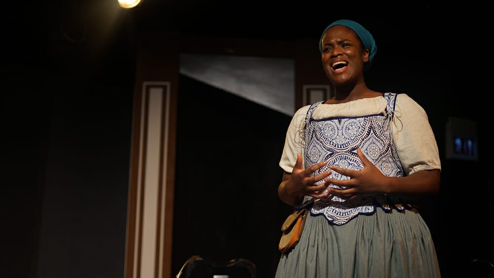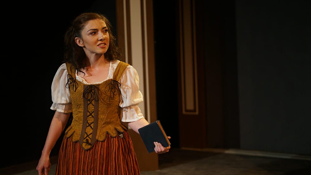 Olympe de Gouges (Stephanie Sullivan) is visited by her fictitious friend Marianne Angelle (Taylor Raye), a spy working for the freedom of France’s colonial slaves. From the start of these two characters’ dialogue, we realize this is a quip-a-second script. By the time Charlotte Corday (Sara Copeland) arrives in search of good lines from playwright Gouge’s pen so she doesn’t sound like a dolt when she murders Jacobin Marat, the playful winks from Gunderson’s pen pick up pace. But it is when Let-them-eat-cake coquette Marie Antoinette (Laura Sturm ) arrives and builds rapport with these three revolutionary oriented women, that we realize we have slipped into a LOL theater of the absurd. This is one heckuva fun production! It is also one that you can enjoy with a surface understanding of these historic figures or an academic’s appreciation of these iconic symbols or any level in between. We are watching the play – or rather the play within a play- unfold in the context of the French revolution. The commentary at the script’s core, from this writer’s view, is more like a Wallace Shawn styled rambling exploration of feminism today.