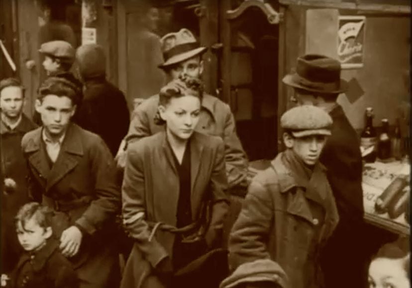 The detail that may be the most shocking to viewers is the Nazi film’s inclusion of the typical images of the holocaust that people in a post-war world are used to seeing. Instead of completely fabricating scenes of the lush life of Warsaw Jews, many of the scenes in The Ghetto show frighteningly real details. Young boys, skin-and-bones with sunken eyes, stumble with hunger on sidewalks that are riddled with both near-death women with crying babies and actual corpses strewn between buildings. But amidst the death and decay of Warsaw walk the protagonists of the Nazis’ propaganda film. They are women in fur hats and coats, wearing lipstick, rouge, and high heels. They walk down the street, ignoring the boys at their ankles begging for food. The cameras follow these women, with their chins up, curls bouncing behind them, leaving the starvation in the background. This, according to the testimony of one of the cameramen, was the real objective of the film: not to deny the horrors of the ghetto, but to show how little the rich Jews cared for their own kinsmen.