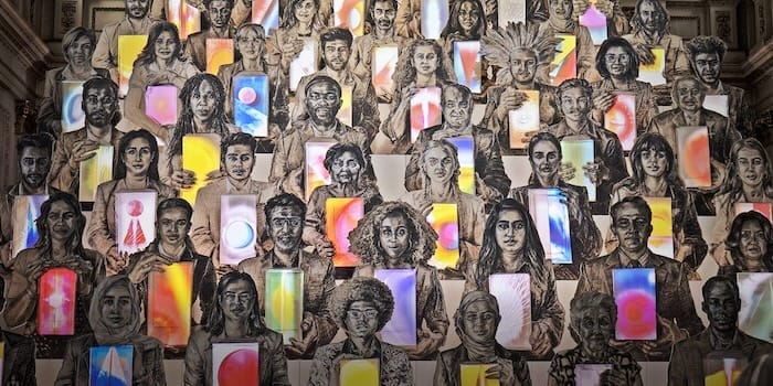 “...Created in partnership with UK for UNHCR, the United Nations Refugee Agency, Devlin made large scale chalk and charcoal portraits of 50 Londoners who have experienced forced displacement from their homelands. Presented as a projection-mapped tiered sculpture, the work offers a luminous encounter with those who bring their gifts to a new country. The deep emotional depths of CONGREGATION allow audiences to experience how art can illuminate powerful human stories.