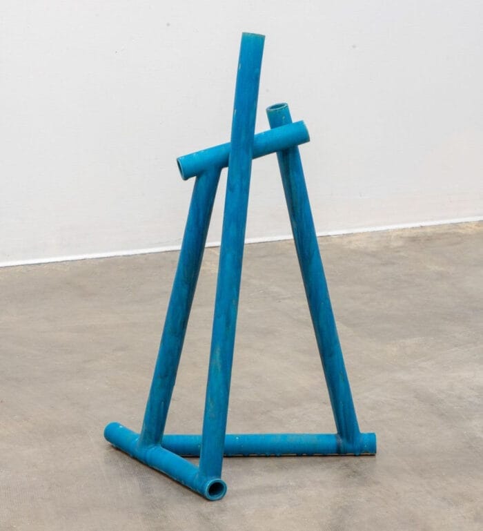 Meticulous techniques with glazes and clays allows Yamada to disguise ceramics as other media. Two sculptures formed of intersecting tubes of clay, for example, are glazed to resemble the patina of aluminum or oxidized copper, while a work from the Gravitation series presents a thin slab of clay, folded and hung over a rope like a piece of fabric.