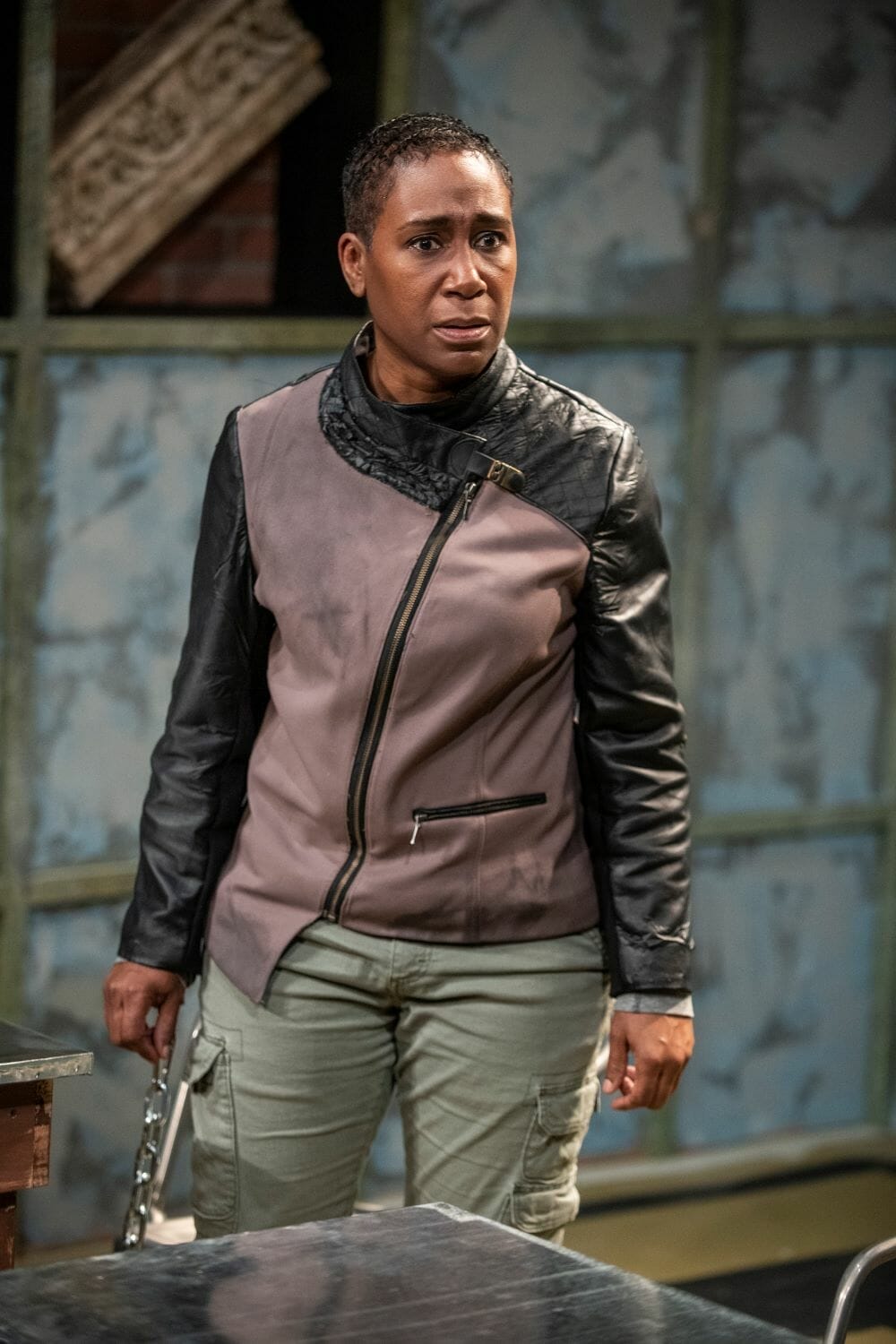 Brown’s script might fall flat if it weren’t for the performances of this pro cast. Slater has the task—and aces it, in this writer’s view—of making an almost cartoonish character come to life with nuance. Rivers electrifies, even silently, as she shifts her focus inwards or out. Rice’s Lt Sawyer is a compellingly cringe-worthy weak everyperson. Pereira’s hysterical cult persona would make her a star in any Moonie gathering. Ramirez peels away the layers in Bianca’s character seamlessly. Brown couldn’t have wished for more than these superb performances—all— and the director’s touches by Devon de Mayo. Of special note to lovers of scenic and projection design is Jeaji Kim’s moving video backdrop telegraphing the characters’ inner lives, and what seems like an uber-subversive touch of decorating the cell with what reminds of antiquity artifacts stolen from museums and world heritage sites.