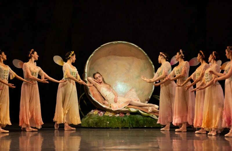 With the help of the San Francisco Ballet School talents, we immediately know we are in a magic land as they assemble, dissolve and re-assemble as a corps de fairy. Here too, Balanchine’s touch is to have these faeries reach upwards in quick quick repetition—evoking wings.