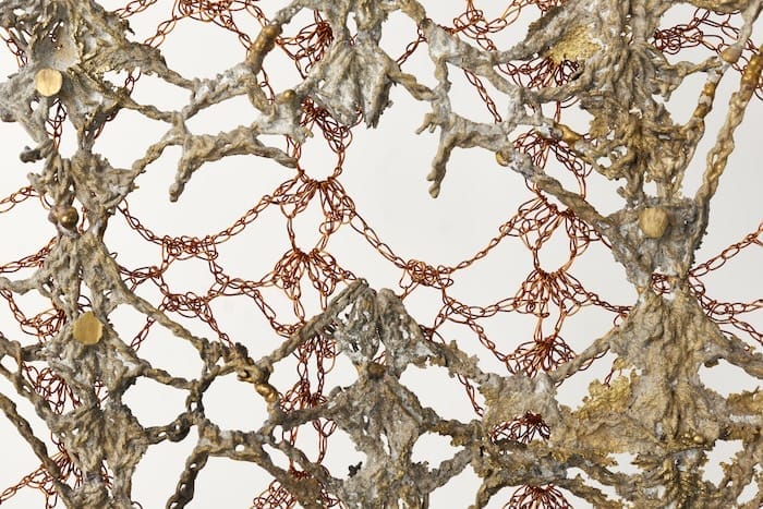 His material vocabulary is unconventional. It includes copper wire, cast metals, glass, clay, horsehair, seashells, leather, onyx, volcanic rock, and in one instance, even a dried pig’s ear, which are crocheted, knotted, woven, or cast into works that are simultaneously vulnerable and resistant, soft and hard, pliable and immobile..."