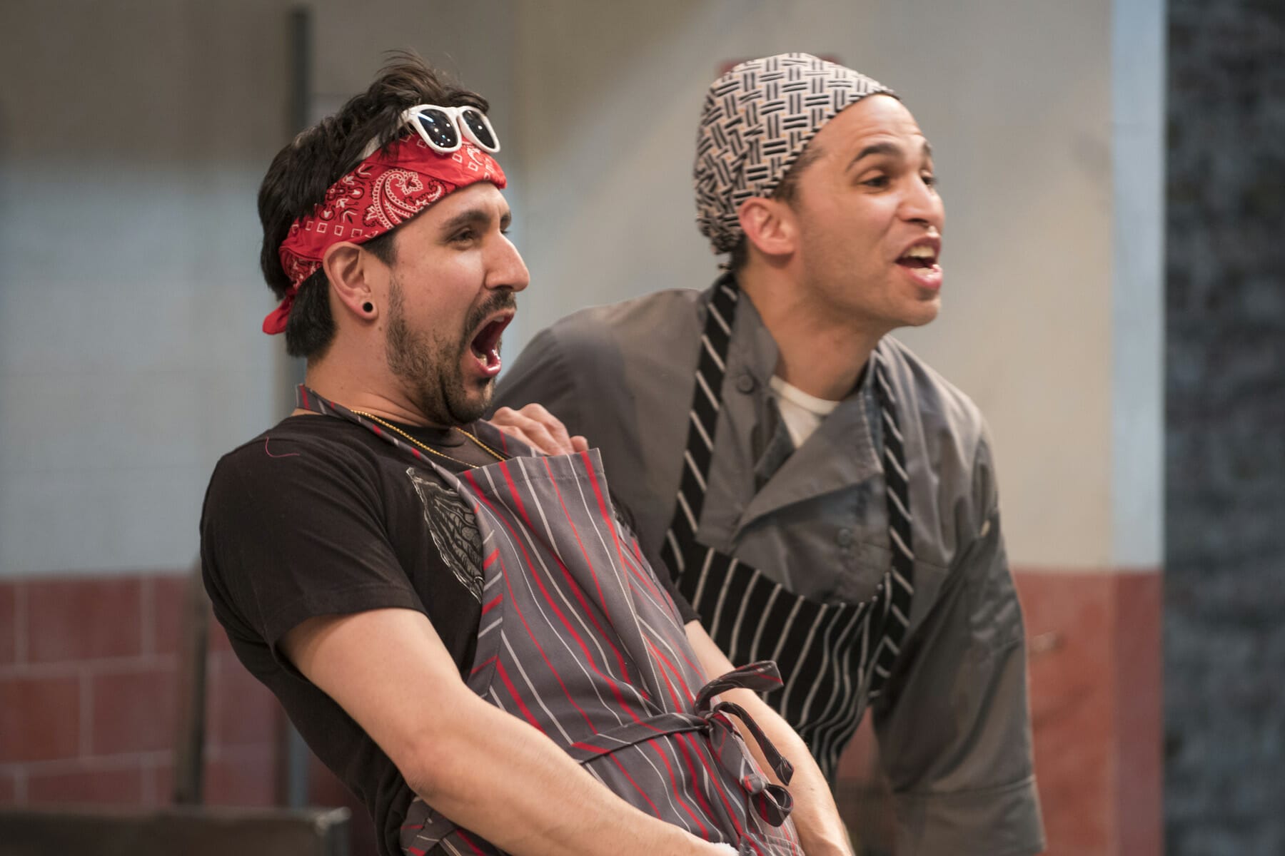 As you enter Theater 3 in Theater Wit, you are immediately immersed in a familiar but not so familiar environment: an middle-brow restaurant kitchen. The level of detail is astounding, from the stocks of inventory, working dish sinks, prep tables, grill with fume hood, and even stains from water damage and age dripping down from the ceiling onto the tiled walls. Calming jazz and other background sounds permeate the entire space. Then, the clinks of knives, the scream of the grill, and the barking of orders is the new cacophony to become accustomed to as the play unfolds. To say it only gets more intense is an understatement.