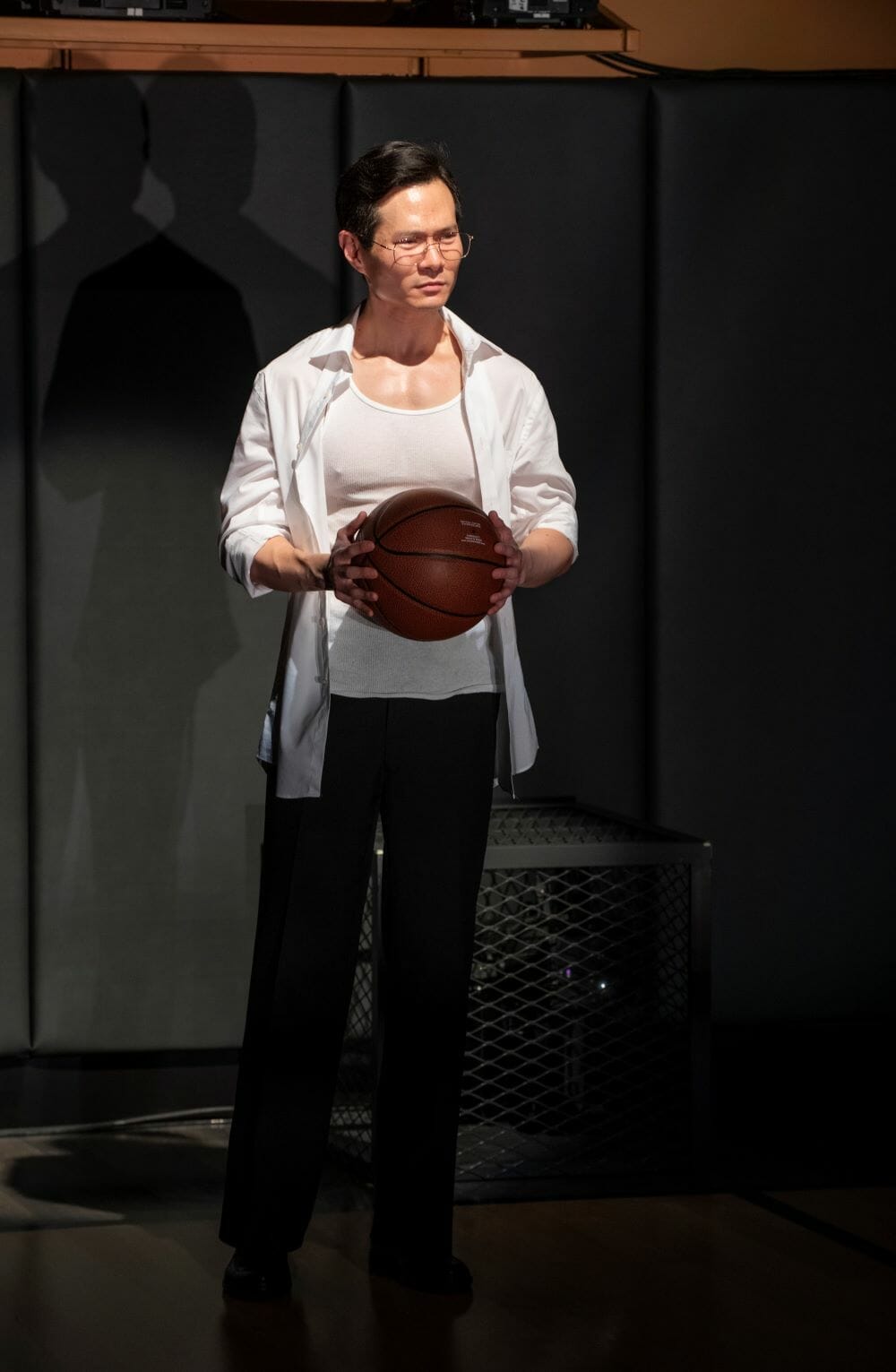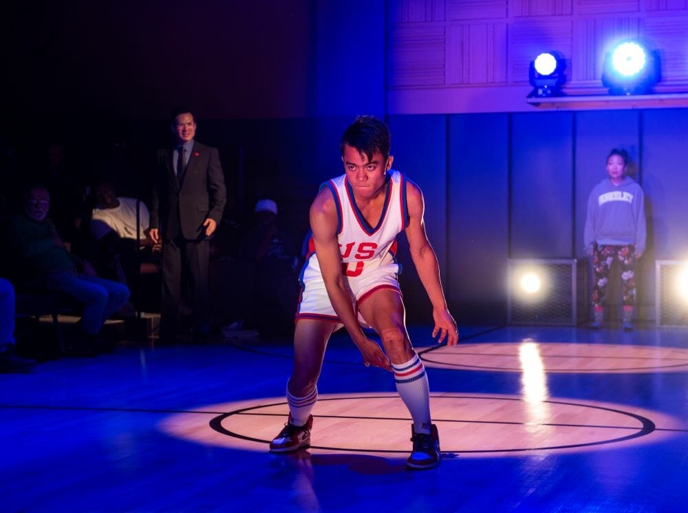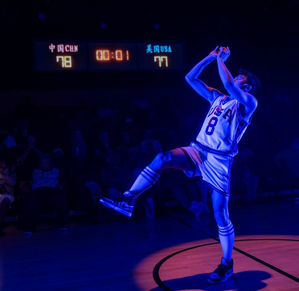 Directed by Jesca Prudencio and designed by Justin Humphres, the story pounds its way on a basketball court without actual hoops. In those positions on either side of the stage are metal grill boxes from which colored spotlights spin and bob like bouncing balls. Above the tiered audience seats are screens that project scoreboards, Beijing street scenes and other visuals that take us back and forth between countries and time periods. From the opening scene when Manford makes his urgent case to Saul till the final moments, the driving intensity doesn’t let up.