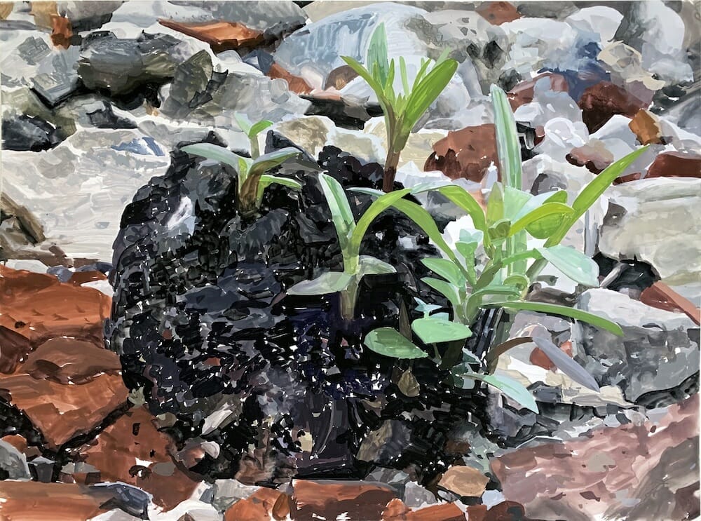 The larger-than-life images of people diminish the images of the fences that intend to separate. There are people in all of the paintings except for one: The Sprouting Seed Bomb. This refers to the one year when community residents constructed balls of mud with embedded flower seeds and threw them into a vacant lot of recently demolished homes. The seeds sprouted. Flowers grew. Contact! Brooklyn lives.
