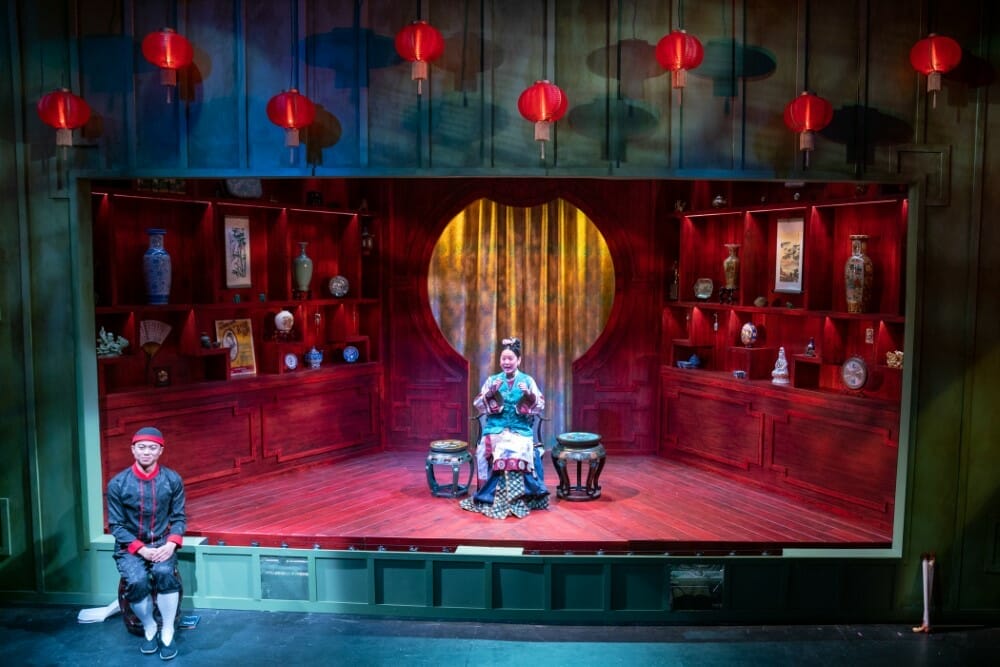 The show is largely a monologue with the audience, occasionally interrupted by interactions with Atung, the young Chinese man who physically raises the curtain and translates Afong’s presentation from Cantonese into English. How does he happen to speak fluent English? No one knows and it doesn’t matter anyway because, we are told, he is “irrelevant.” Glenn Obrero brings much to his smaller role. Many scenes into the two-character script, he conveys just how tight his character’s emotional straightjacket has become as he eyes the rope that lifts the curtain. No words, just an overwhelming despair that convinces us that Atung sees a hangman’s noose in the gently-swaying golden cord.